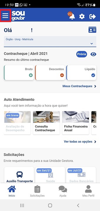 1ºPasso: Para visualizar o comprovante da sua Prova de Vida, acesse o aplicativo SouGov.br e, na página inicial, clique nas linhas ao lado do nome SouGov.br e depois na opção “Prova de Vida”.