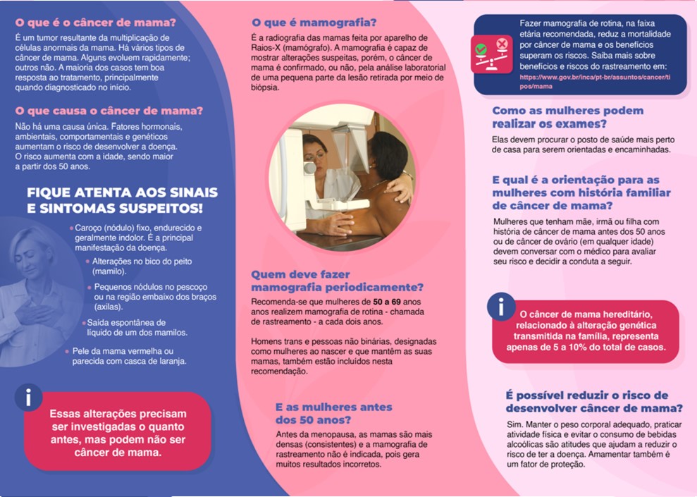 O câncer de mama é o tipo de câncer que mais acomete as mulheres no Brasil. A prevenção primária e a detecção precoce contribuem para a redução da incidência e da mortalidade por essa neoplasia. A população deve ser informada quanto ao tema para que possa adotar medidas que protejam a sua saúde.
