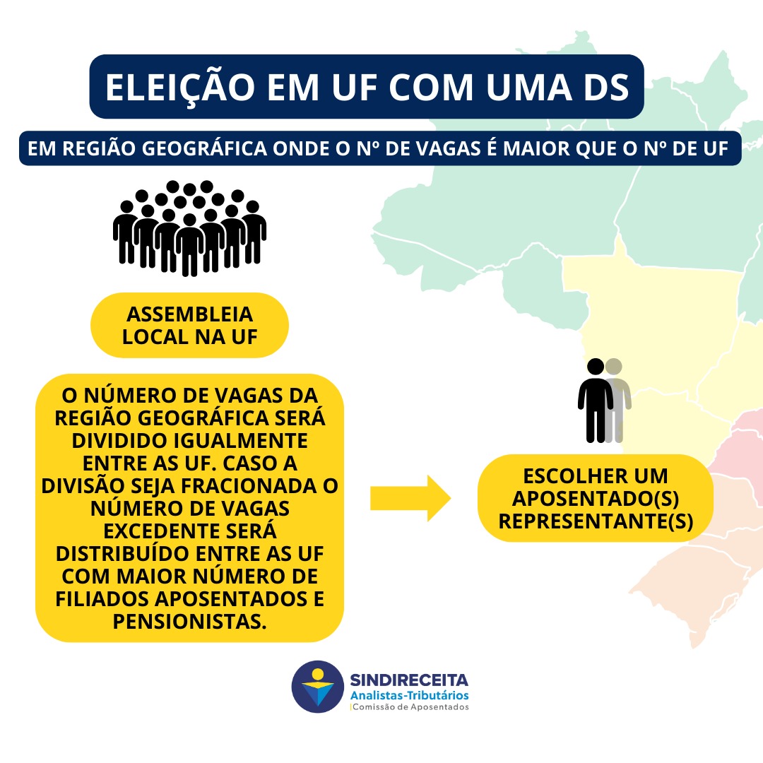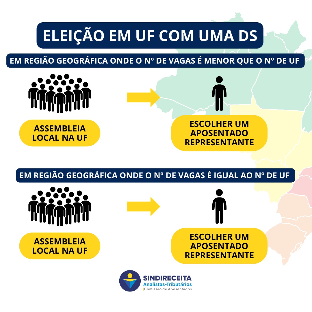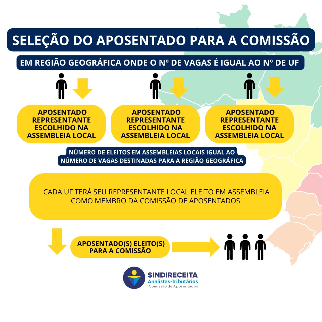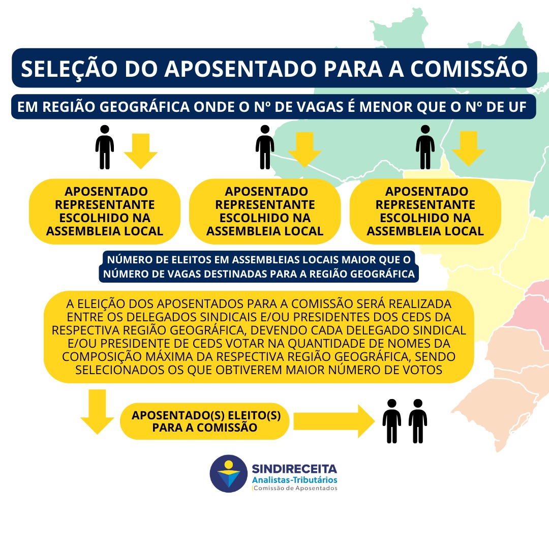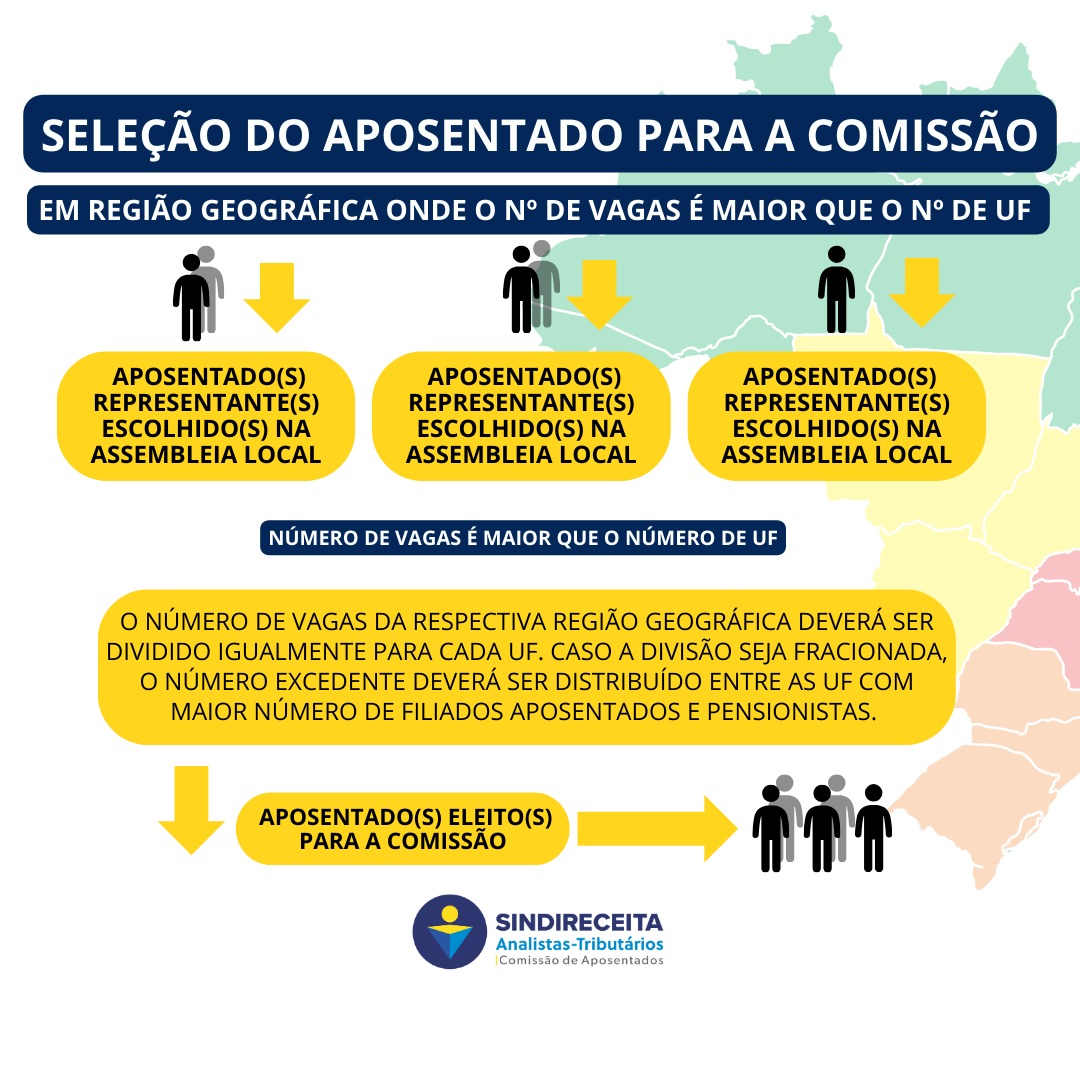 As previsões relacionadas à seleção dos aposentados e aposentadas para a representação de cada Unidade Federativa (UF) e por Região Geográfica encontram-se expressas no Artigo 3º e no Artigo 4º da Resolução DEN/Sindireceita nº 02, respectivamente.
