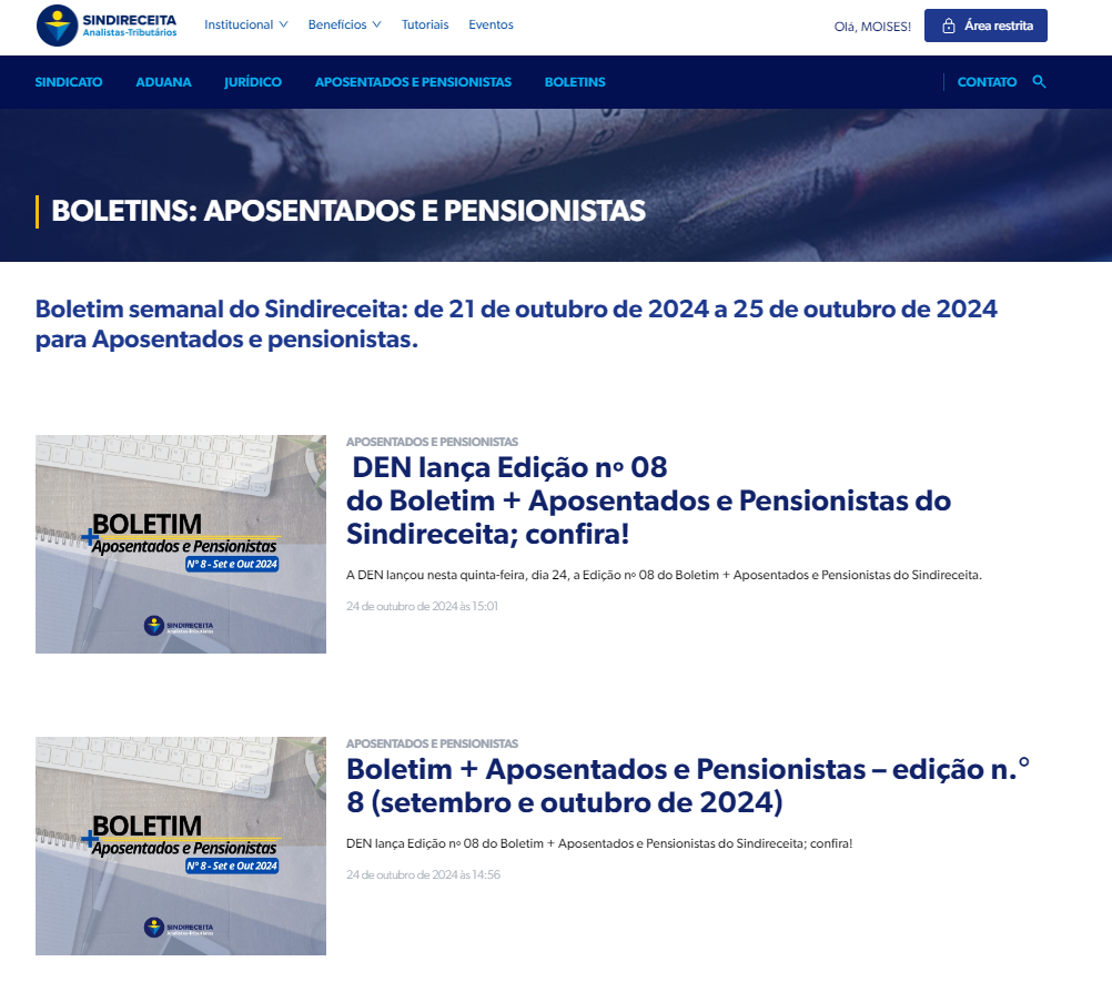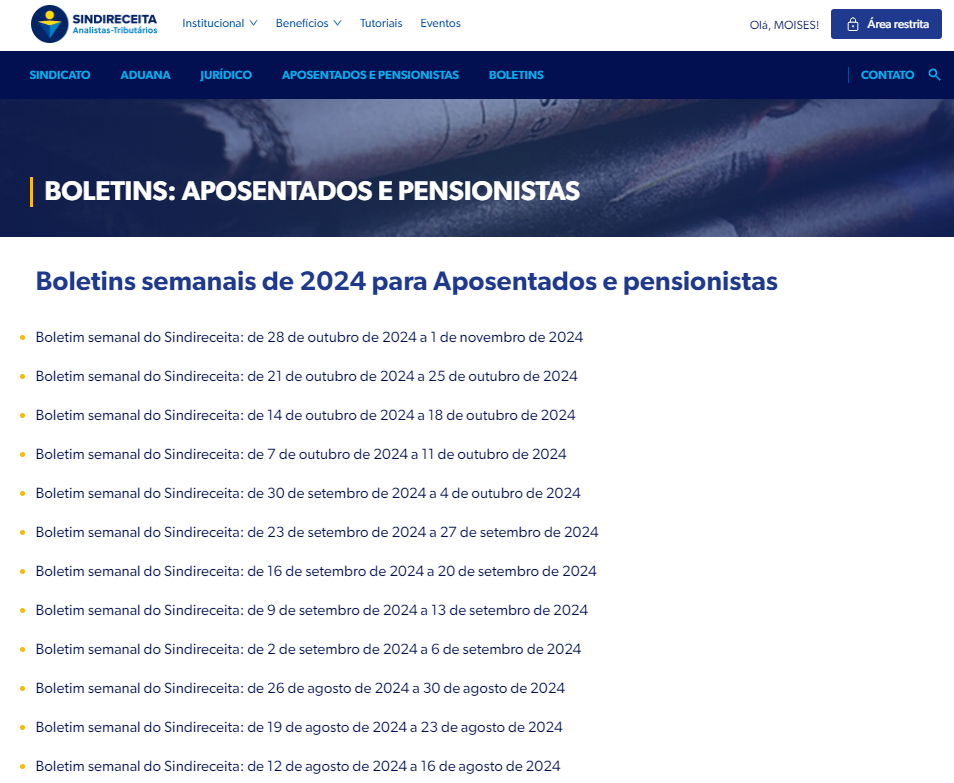 Na opção “Boletins” estão disponibilizados boletins semanais com as notícias exclusivas para Aposentados e Pensionistas, produzidas, publicadas e divulgadas pela Diretoria de Comunicação do Sindireceita.