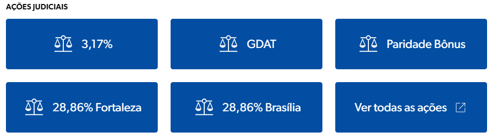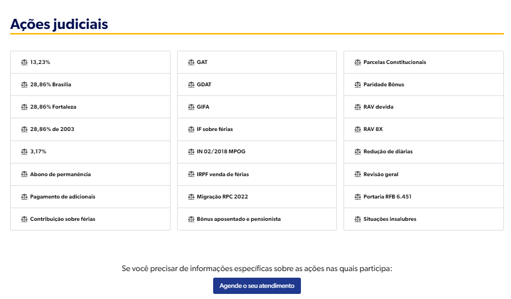 Observação: o botão “Ver todas as ações” o filiado ou filiada será direcionado para uma página com todas as ações do Sindireceita. Para acessar as informações sobre a ação escolhida, basta clicar no botão com o nome da ação. Também está disponível o botão "Agende o seu atendimento", caso o filiado ou filiada queira saber sobre sua situação particular em uma ação.