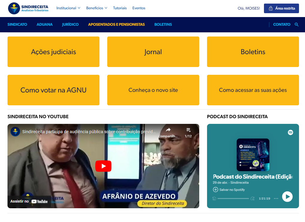A página dos Aposentados e Pensionistas ainda está em construção para trazer mais facilidades e informações. Teremos novidades no acesso às ações por parte dos filiados e filiadas, e logo disponibilizaremos acessos a playlist de vídeos dos Boletins “Mais Aposentados e Pensionistas” e a playlist do “Ouça Sindireceita”.