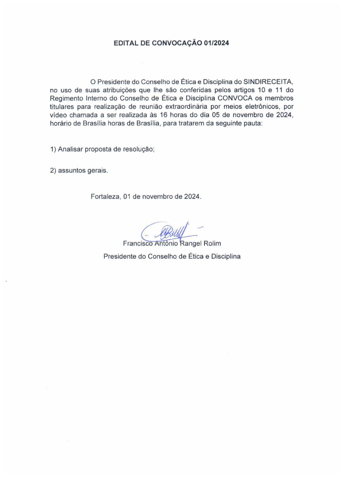 O presidente do CET Sindireceita convoca os membros titulares para realização de reunião extraordinária, por vídeo chamada, a ser realizada às 16h do dia 5 de novembro de 2024.