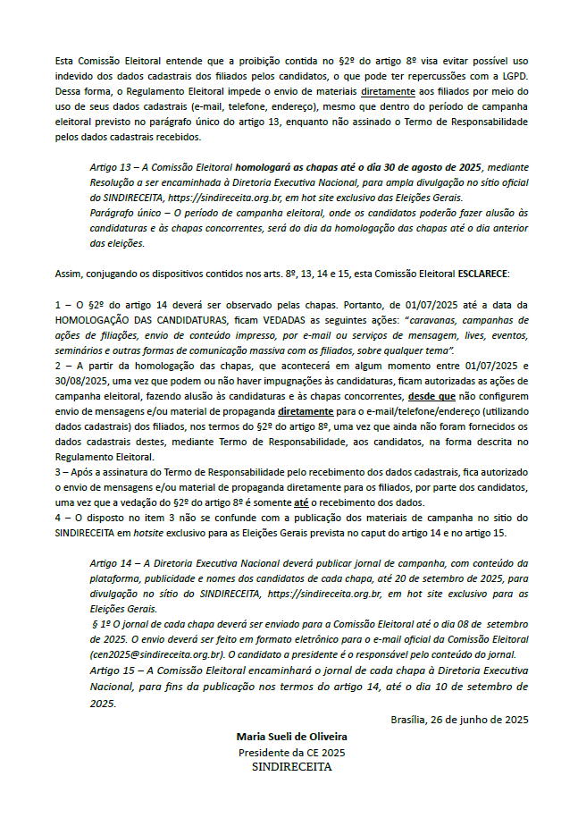 1 – O §2º do artigo 14 deverá ser observado pelas chapas. Portanto, de 01/07/2025 até a data da HOMOLOGAÇÃO DAS CANDIDATURAS, ficam VEDADAS as seguintes ações: “caravanas, campanhas de ações de filiações, envio de conteúdo impresso, por e-mail ou serviços de mensagem, lives, eventos, seminários e outras formas de comunicação massiva com os filiados, sobre qualquer tema”.