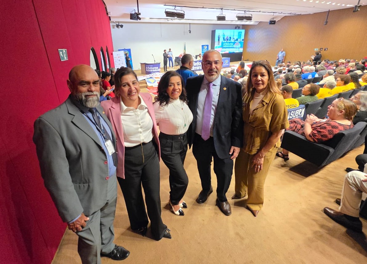 Representantes do Sindireceita participaram na tarde dessa terça-feira, dia 8, do Seminário “A Reforma Administrativa”, promovido pela Frente Parlamentar Mista em Defesa do Serviço Público, no Auditório Nereu Ramos da Câmara dos Deputados. Pelo Sindicato, estiveram presentes no evento o presidente da Diretoria Executiva Nacional (DEN), Thales Freitas; a Secretária-Geral, Ieda Miranda; a diretora Marlene Cambraia (Aposentados e Pensionistas); o diretor Afrânio Azevedo (Primeiro Suplente); e a Secretária-Geral da Delegacia Sindical de Brasília/DF, Verônica Oliveira.