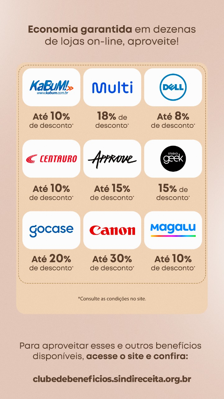 Nesta semana, filiadas e filiados ao Sindireceita aproveitam descontos especiais em eletrônicos, itens esportivos, roupas, perfumes, calçados e muito mais. São várias lojas com ofertas pensadas para presentear no Dia dos Pais.