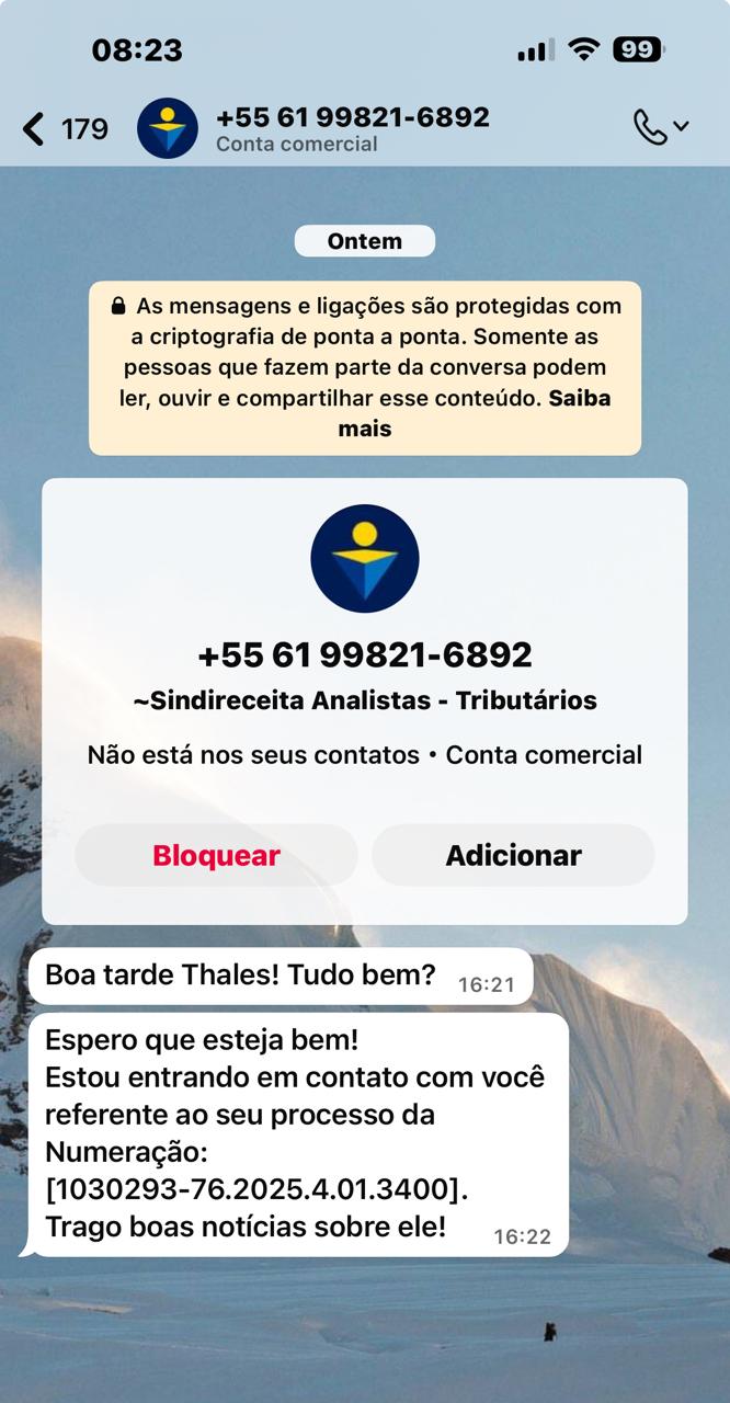 A DEN solicita aos filiados e filiadas que em nenhuma hipótese repassem informações pessoais a contatos como este. Destacamos, ainda, que todos os tipos de abordagens (carta, telefone, e-mail ou WhatsApp, entre outras), oriundas de pessoas e/ou escritórios, mesmo que supostamente conhecidos como parceiros do Sindireceita, devem ter a sua autenticidade confirmada junto à Diretoria Executiva Nacional, por meio da Diretoria de Assuntos Jurídicos (DAJ). Para ajudar os filiados e filiadas a não caírem em "armadilhas" reunimos um conjunto de dicas sobre como evitar golpes pelo WhatsApp (clique aqui para conferir).