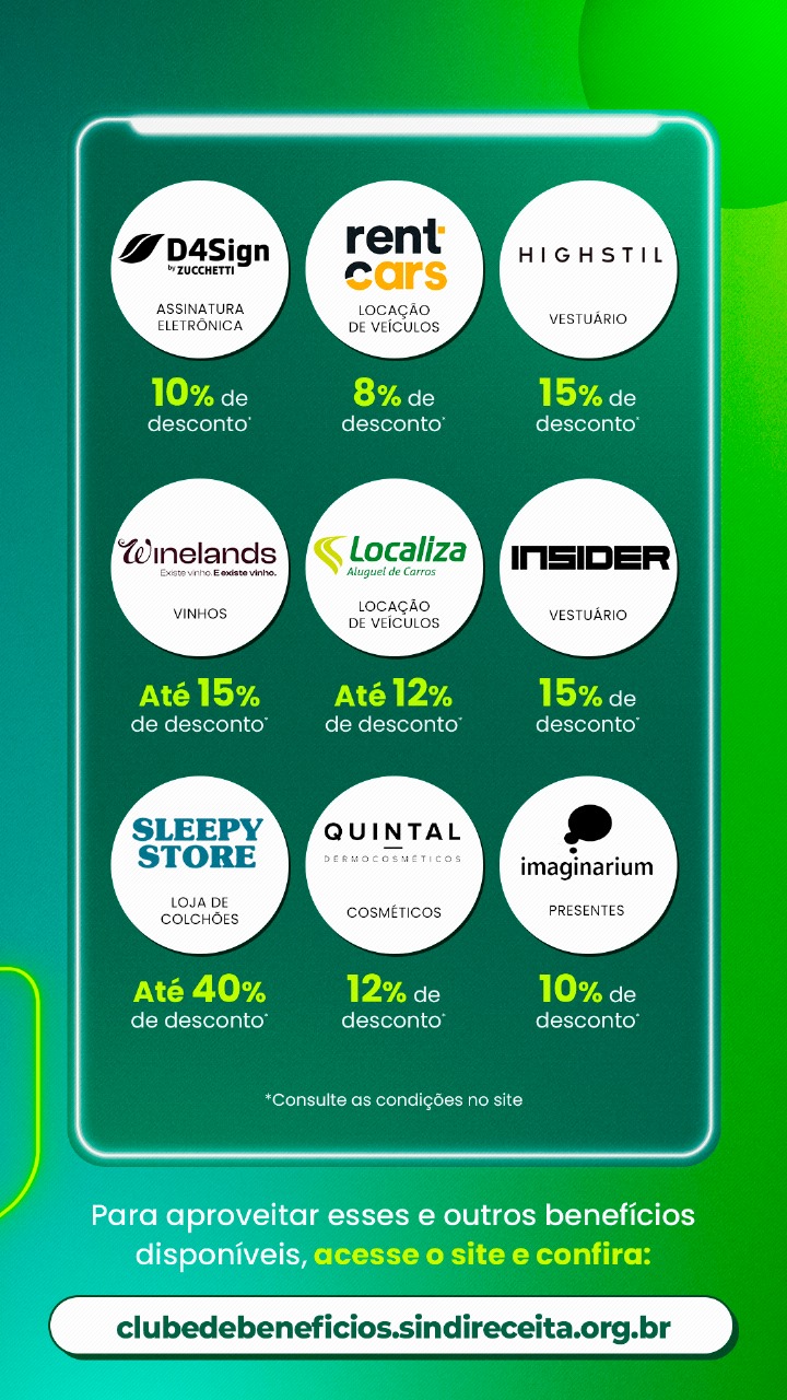 Nesta semana, filiadas e filiados ao Sindireceita contam com um catálogo ainda mais completo! Novas lojas foram adicionadas ao Clube de Benefícios do Sindireceita, com ofertas que chegam a até 40% de desconto em diversas categorias.