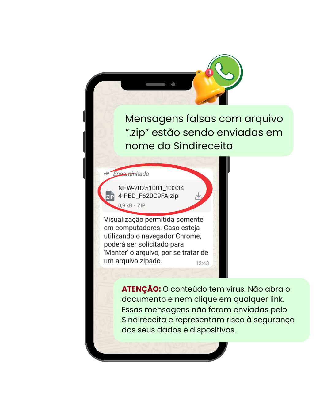 O Sindireceita alerta filiadas e filiados sobre o envio de mensagens falsas com arquivos em formato “.zip”, que estão sendo disseminadas em nome do setor administrativo do Sindicato.