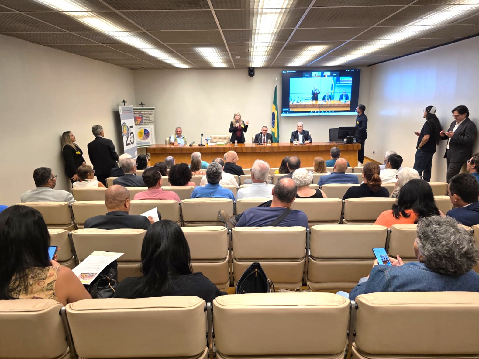 As diretoras do Sindireceita, Ieda Miranda (Secretária Geral), Marlene Cambraia (Aposentados e Pensionistas), e o diretor Valdemir Bueno (Segundo Suplente) participaram nesta quinta-feira, dia 9, da celebração dos 25 anos da Auditoria Cidadã da Dívida (ACD). O evento ocorreu em formato híbrido, em modalidade virtual e presencial, no Auditório Freitas Nobre da Câmara dos Deputados, em Brasília/DF, e reuniu dezenas de participantes, incluindo integrantes de movimentos da sociedade civil e entidades de representação dos servidores públicos.