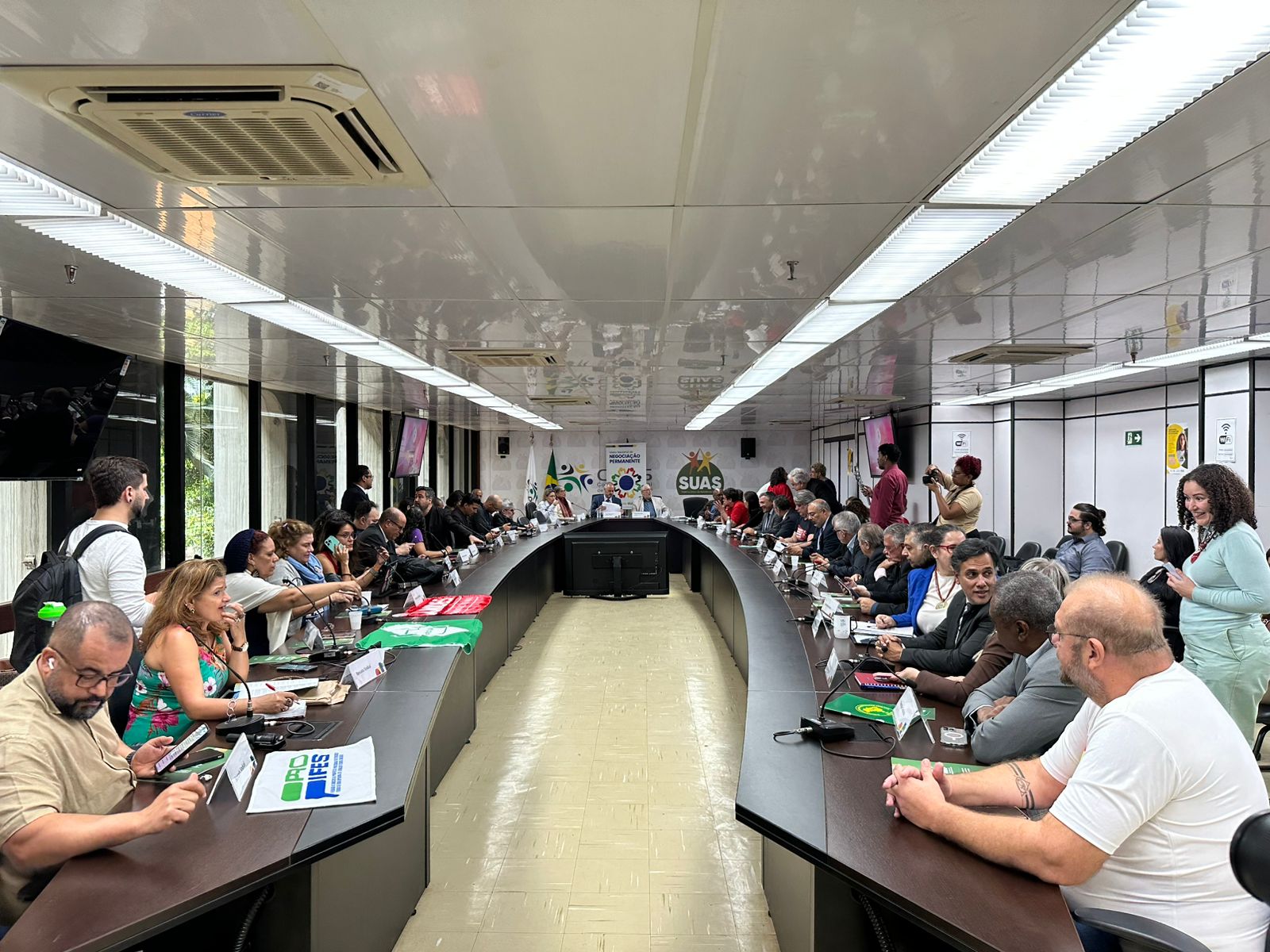 O presidente do Sindireceita, Thales Freitas, e o diretor de Assuntos Parlamentares, Sérgio Ricardo Moreira, participaram da 12ª Reunião da Mesa Nacional de Negociação Permanente (MNNP), realizada nesta quarta-feira, 22 de outubro. O encontro aconteceu na sala do Conselho Nacional de Assistência Social (CNAS) e reuniu representantes do governo federal e de entidades representativas das servidoras e dos servidores públicos.