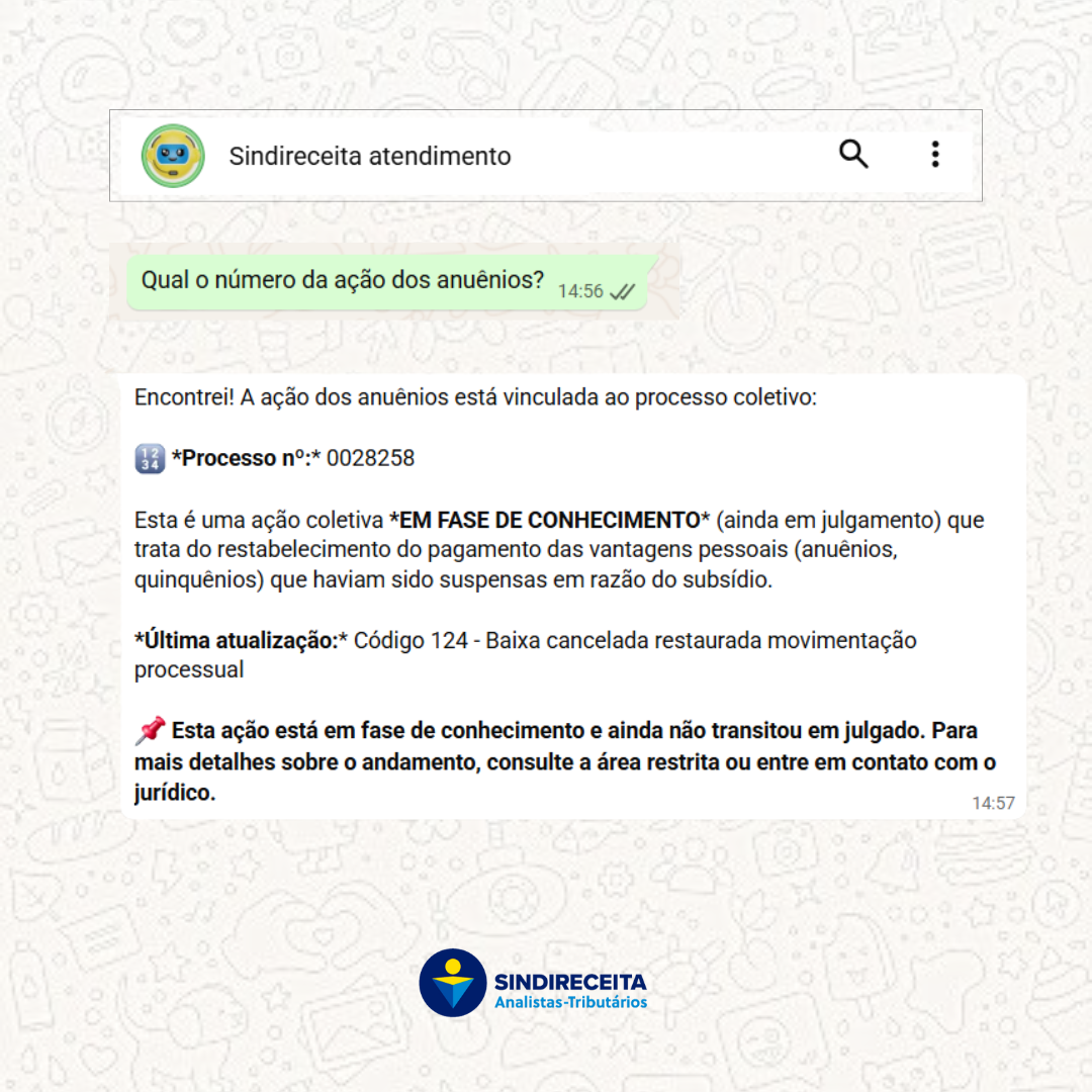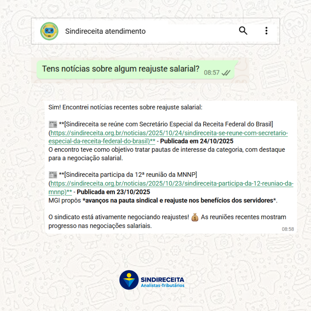 É muito importante, especialmente durante as primeiras interações que os filiados façam perguntas diretas e específicas. Assim como toda ferramenta de IA, a assertividade e a objetividade das respostas tornam-se cada vez mais eficiente a cada interação. A Diretoria Executiva Nacional ressalta que, caso as respostas não contemplem as solicitações e ou apresentem falhas e inconsistências, os filiados devem informar à DEN por meio do endereço eletrônico comunicacao@sindireceita.org.br