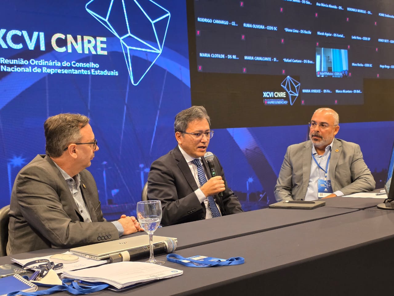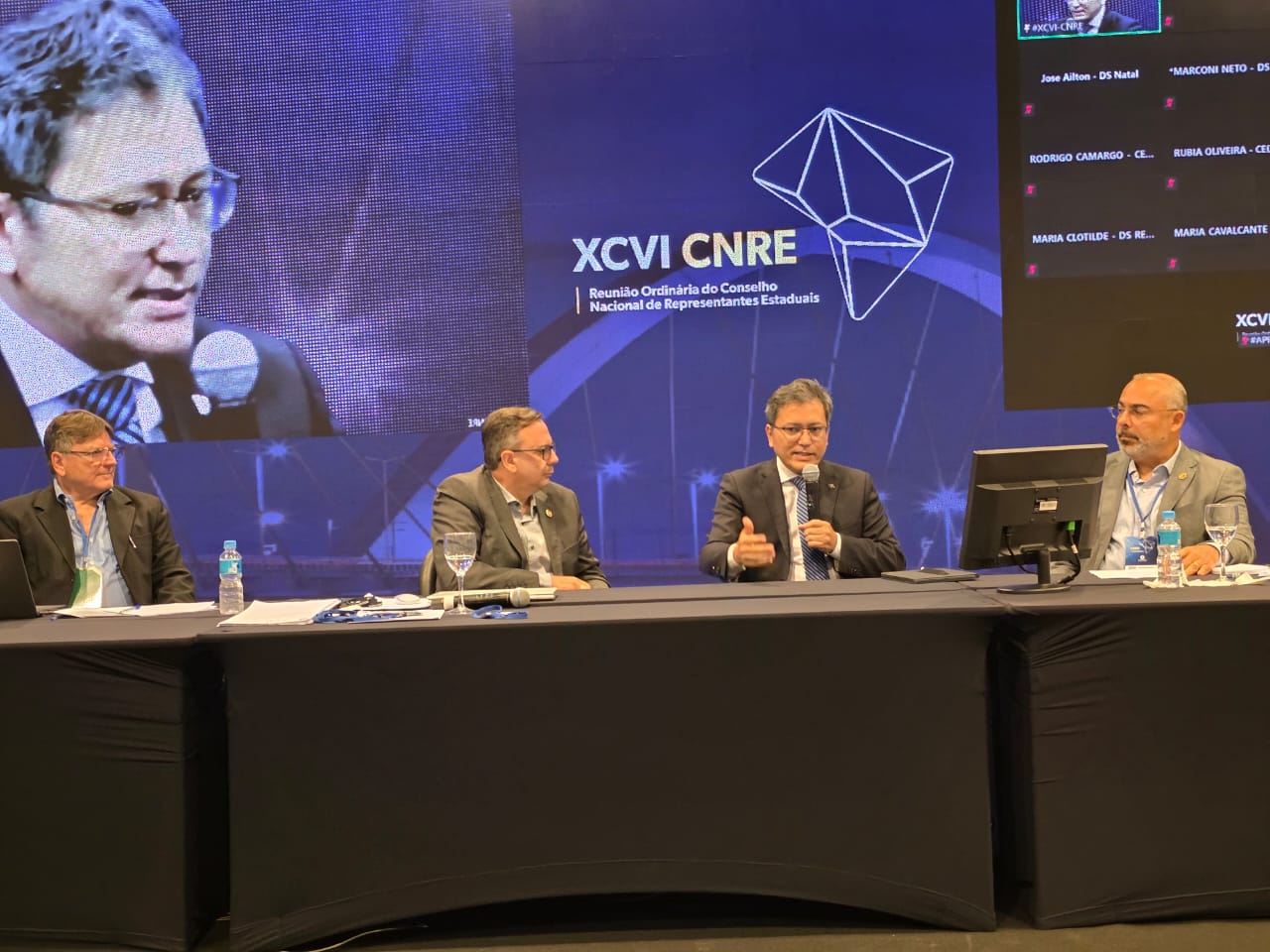 O secretário da Receita Federal do Brasil, Robinson Barreirinhas, participou nesta quinta-feira, dia 4, da XCVI Reunião Ordinária do Conselho Nacional de Representantes Estaduais (CNRE) do Sindireceita. O secretário destacou o compromisso da administração com a valorização dos servidores e o fortalecimento institucional da Receita Federal. “Fiz questão de estar aqui hoje para agradecer aos Analistas-Tributários por tudo que fizeram pela Receita Federal”, completou.