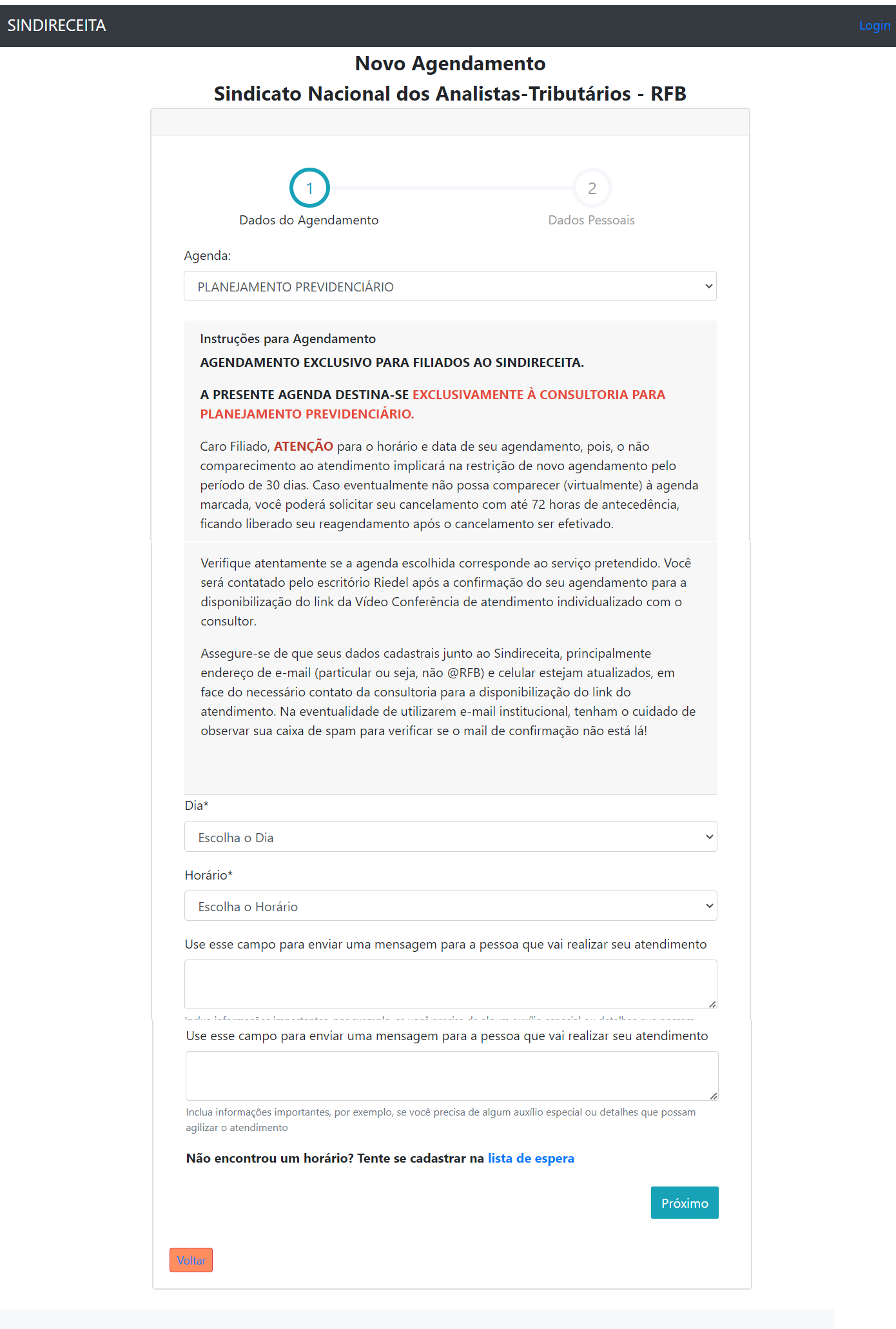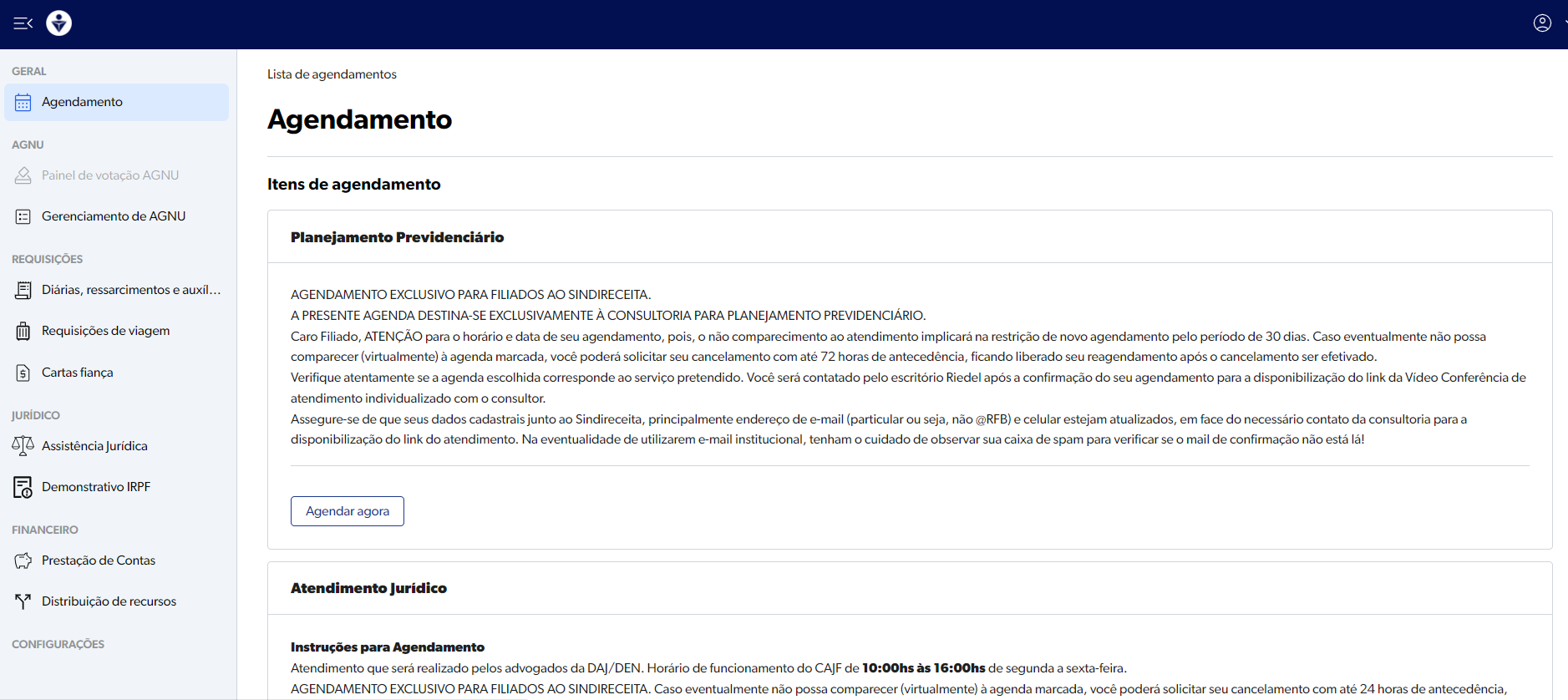 Os atendimentos são realizados mediante agendamento prévio, disponível na área restrita do filiado, pelo endereço: https://sindireceita.org.br/app/start/schedule . Para a efetivação do agendamento, é indispensável que os dados cadastrais — especialmente e-mail e telefone com DDD — estejam atualizados, uma vez que as confirmações e orientações são encaminhadas por esses canais.