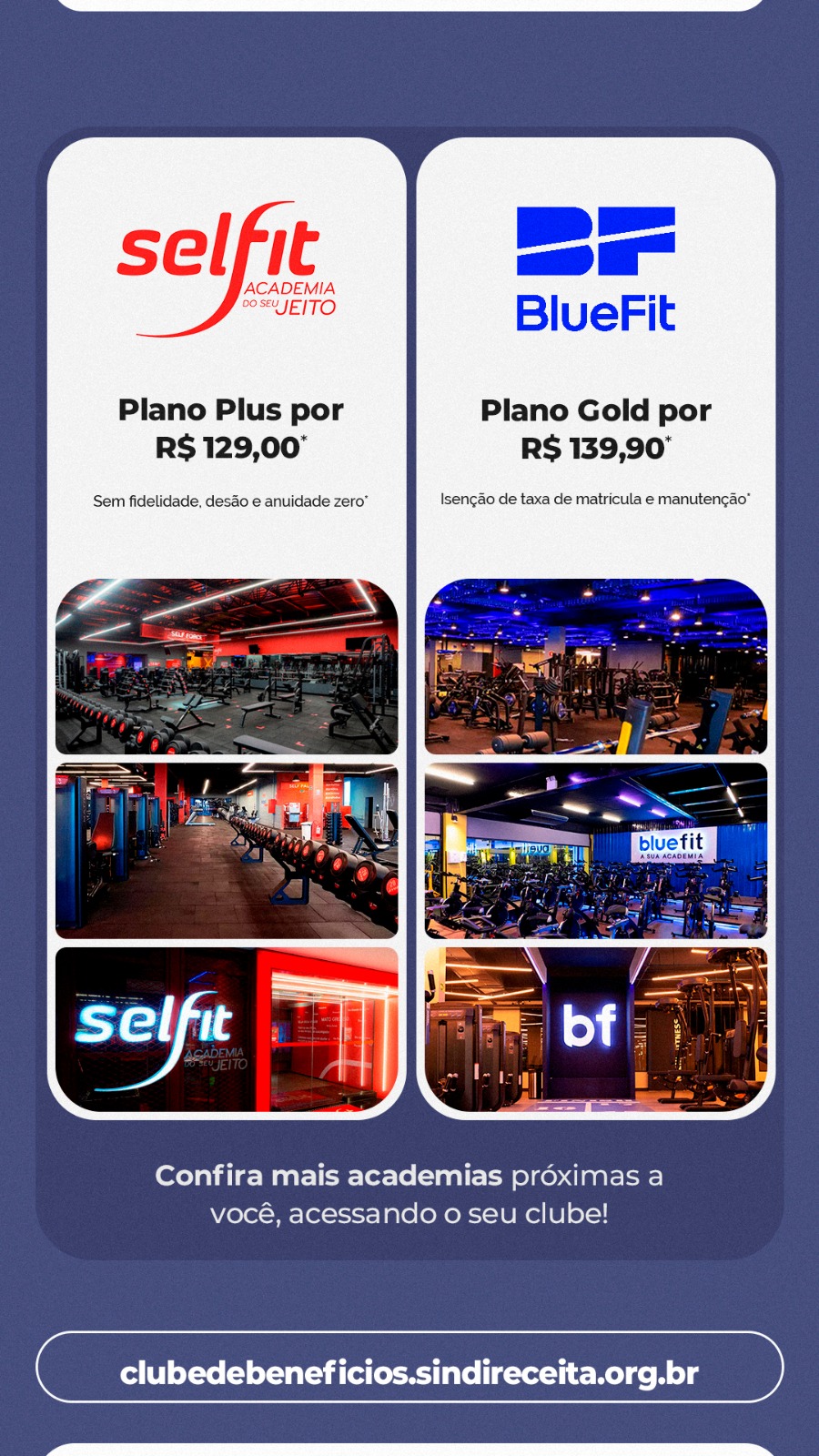 Na Selfit, os filiados e filiadas contam com Plano Plus por R$ 129,00 sem fidelidade, adesão e anuidade zero. O Clube de Benefícios também oferece Plano Gold por R$ 139,90 na Bluefit, com isenção de taxa de matrícula e manutenção. No site do Clube (clique aqui), os filiados e filiadas também podem conferir descontos exclusivos em academias localizadas nas suas respectivas regiões.