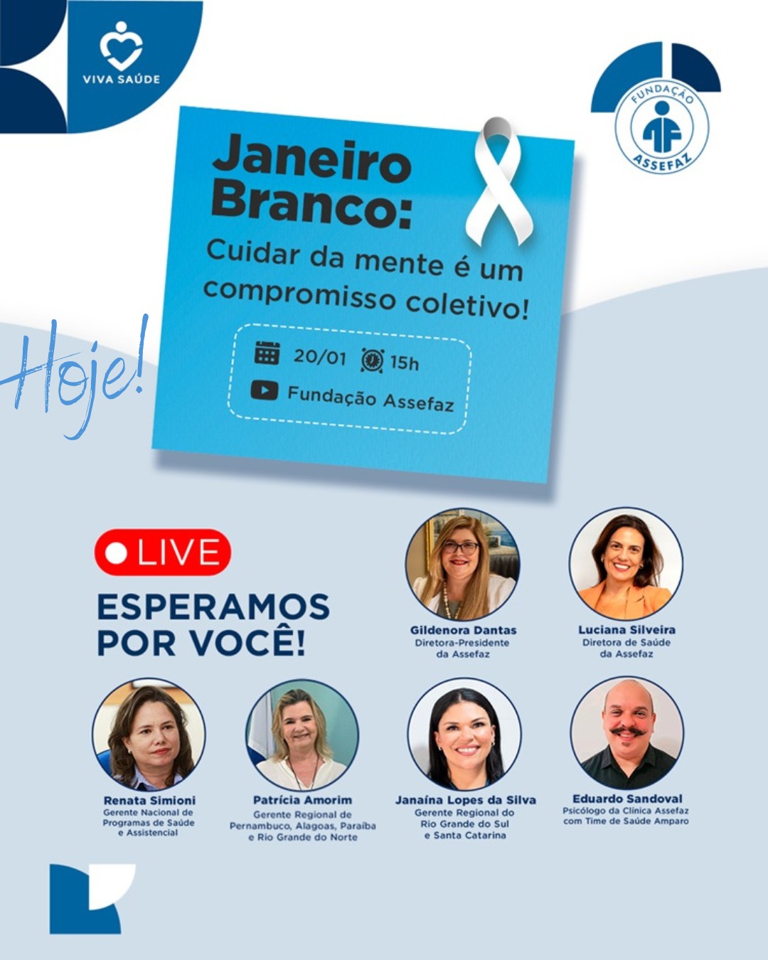 A transmissão ao vivo integra as ações da Fundação relacionadas à campanha de Janeiro Branco, que tem como objetivos ressaltar a importância da saúde emocional como prioridade e mostrar como pequenas atitudes podem levar a grandes mudanças no dia a dia. Durante a Live, os titulares da Assefaz esclarecerão dúvidas da audiência relacionadas a temas como autocuidado, sinais de atenção, relações equilibradas, entre outros. Para interagir com os representantes da Assefaz e com os espectadores, basta utilizar o chat ao vivo da transmissão no YouTube.