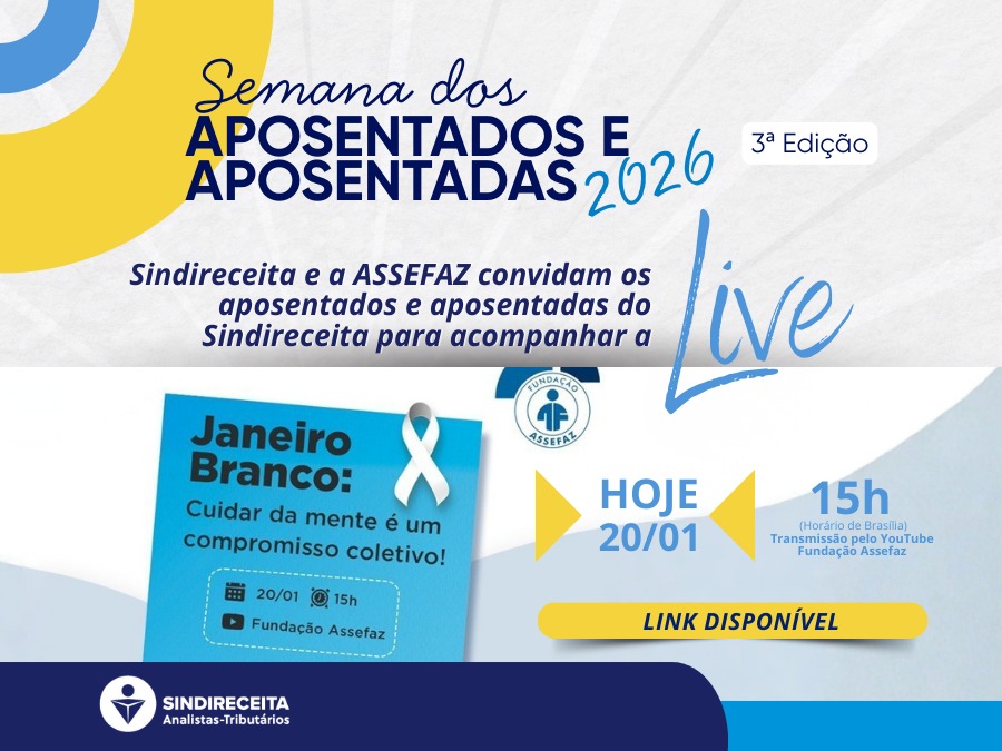O Sindireceita e a Fundação Assistencial dos Servidores do Ministério da Fazenda (Fundação Assefaz) convidam os colegas aposentados e aposentadas filiados a participarem nesta terça-feira, dia 20, às 15h (horário de Brasília/DF), da Live “Janeiro Branco: Cuidar da mente é um compromisso coletivo!”. O convite para a transmissão ao vivo, que será realizada pela Fundação, integra as ações do Sindicato no âmbito da Semana dos Aposentados e Aposentadas 2026 – 3ª Edição. A Live será transmitida no YouTube da Fundação Assefaz (clique aqui para participar).