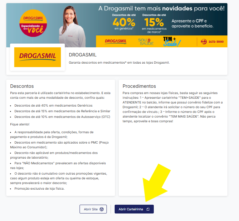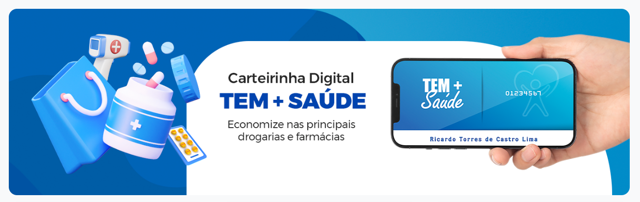 A carteirinha TEM MAIS SAÚDE, ficará disponível toda vez que você realizar uma consulta a drogarias que são parceiras do nosso Clube de Benefícios. Clique na opção ABRIR CARTEIRINHA e apresente a imagem disponibilizada para a pessoa que estiver lhe atendendo. A imagem terá seu CPF, a logo do TEM + SAÚDE e o seu nome completo. Seus descontos serão identificados no sistema da drogaria.