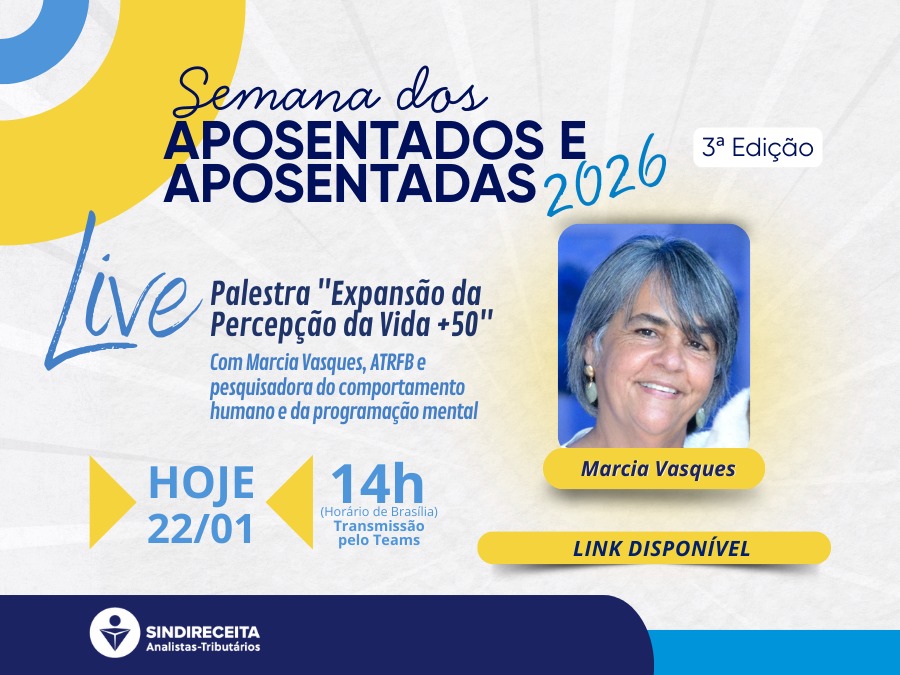“Expansão da Percepção da Vida 50+” será o tema de palestra ministrada pela Analista-Tributária e pesquisadora Márcia Vasques, durante Live especial que será realizada às 14h desta quinta-feira, dia 22. Promovida pelo Sindireceita, a Live/Palestra integra a programação da Semana dos Aposentados e Aposentadas 2026. A transmissão ao vivo é dedicada aos colegas aposentados e aposentadas filiados do Sindicato em todo o Brasil e será realizada por meio da plataforma Teams.