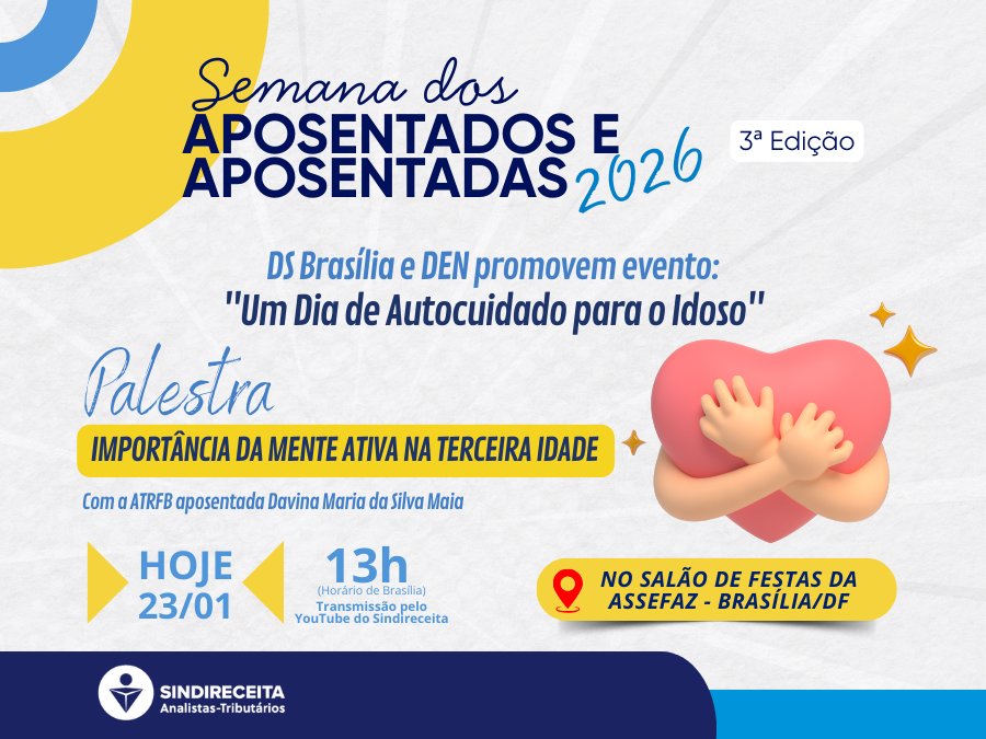 Como parte da programação da Semana dos Aposentados e Aposentadas do Sindireceita, a Delegacia Sindical de Brasília, em conjunto com a Diretoria Executiva Nacional (DEN), promove nesta sexta-feira, 23 de janeiro, o Dia de Autocuidado para o Idoso, na Assefaz.
