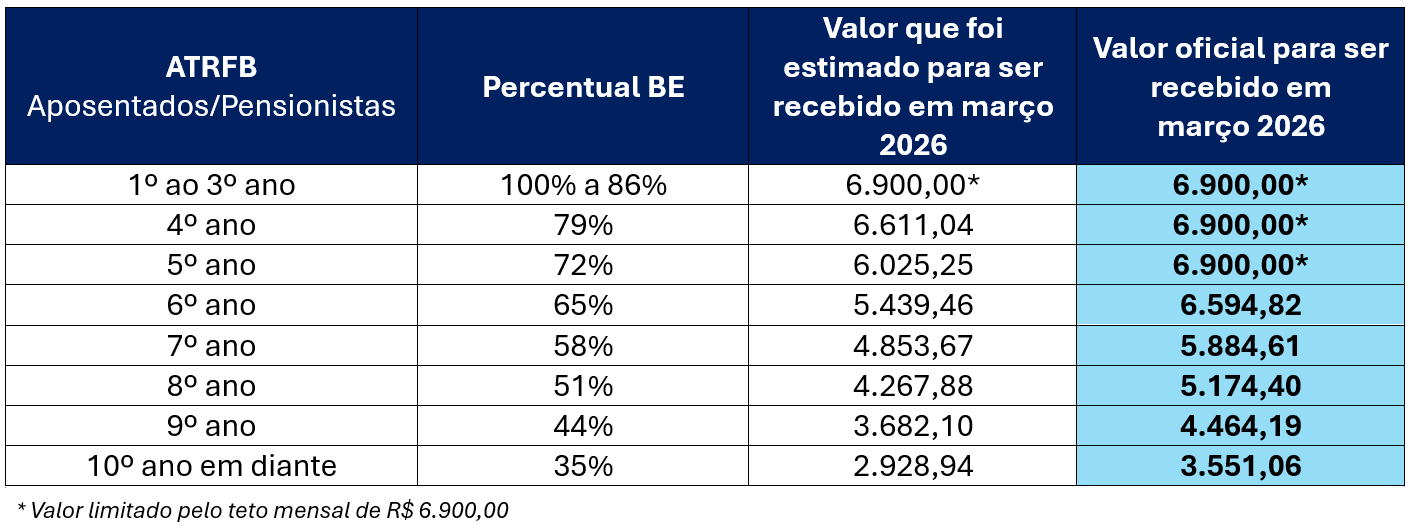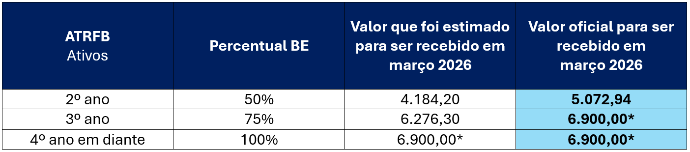 Para facilitar a visualização das diferenças, apresentamos abaixo uma tabela comparativa detalhando os valores estimados e os valores oficiais para os ATRFB, tanto ativos quanto aposentados e pensionistas: