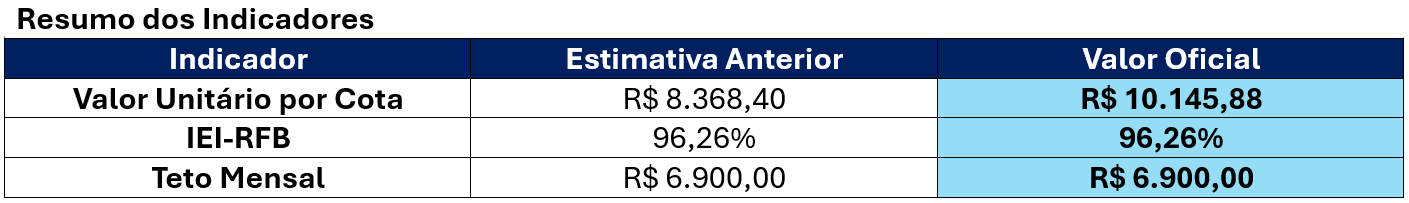 Em 3 de fevereiro de 2026, publicamos uma nota (Leia AQUI) com as projeções para o BE que seria pago em março 2026, baseadas nas informações disponíveis até então. Agora, com o conhecimento dos valores oficiais, confirmamos que o Valor Unitário por Cota Devido ao ATRFB foi estabelecido em R$ 10.145,88, significativamente superior aos R$ 8.368,40 estimados. O Limite Mensal Atribuído aos ATRFB permanece em R$ 6.900,00.