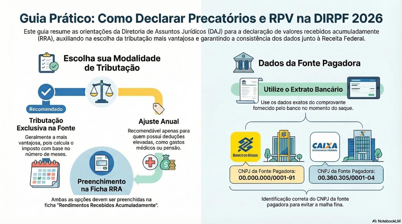 A Diretoria de Assuntos Jurídicos (DAJ) do Sindireceita disponibilizou no canal do Sindireceita no Youtube a transmissão da Live, que realizada no último dia 23, que teve tratou das orientações para declaração dos valores recebidos em precatórios e Requisições de Pequeno Valor (RPV) na Declaração de Ajuste Anual do Imposto sobre a Renda da Pessoa Física (DIRPF) 2026, referente ao ano-base 2025.