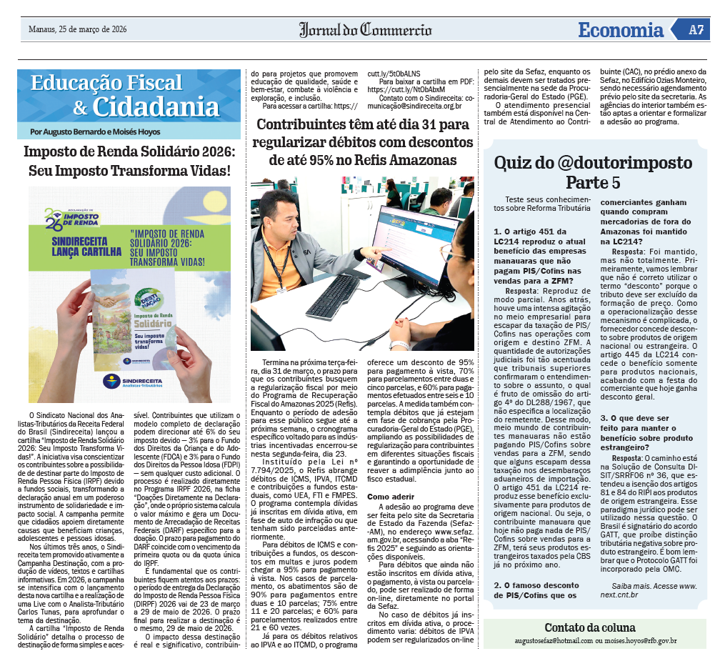 O Jornal do Commercio publicou, nesta quarta-feira, dia 25, um artigo sobre a cartilha "Imposto de Renda Solidário 2026: Seu Imposto Transforma Vidas!", lançada pelo Sindireceita na data de ontem. O artigo é de autoria do Analista-Tributário e diretor de Comunicação do Sindireceita, Moisés Hoyos e do Auditor-Fiscal de tributos estaduais da Associação dos Servidores Fiscais do Estado do Amazonas (Assefaz-AM) e coordenador da campanha Nota Fiscal Amazonense e do programa de Educação Fiscal no estado, Augusto Bernardo. Acesse a íntegra do artigo aqui.
