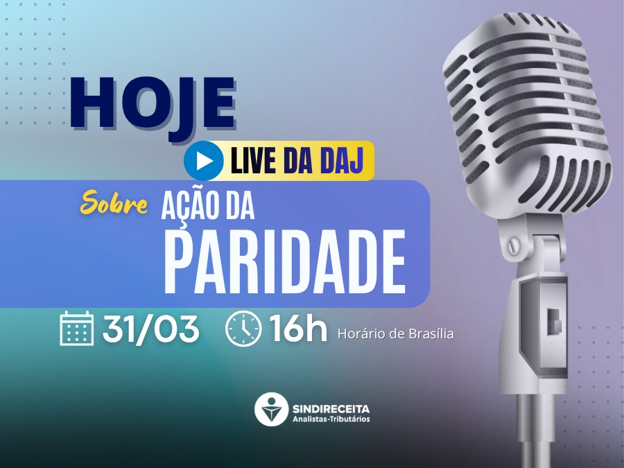 A Diretoria de Assuntos Jurídicos (DAJ) do Sindireceita tem um convite especial para você, colega filiada e filiado! Participe da Live sobre as ações coletivas da paridade nesta terça-feira, dia 31, às 16h (horário de Brasília/DF). A transmissão ao vivo será realizada pelo escritório Pollet Freire Advogados e contará com a participação do advogado Dr. Elias Freire, que patrocina as ações coletivas do Sindicato.
