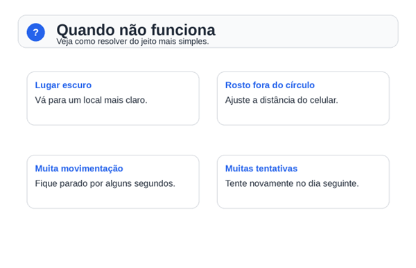 Se não funcionar na primeira tentativa, não precisa se assustar. Muitas vezes o problema acontece porque o lugar está escuro, o rosto ficou fora do círculo ou a pessoa mexeu a cabeça sem perceber. Nesses casos, a orientação é mudar para um local mais claro, ajustar a posição do celular e tentar de novo. Se houver muitas tentativas inválidas no mesmo dia, o sistema pode bloquear temporariamente, e o melhor é esperar até o dia seguinte.